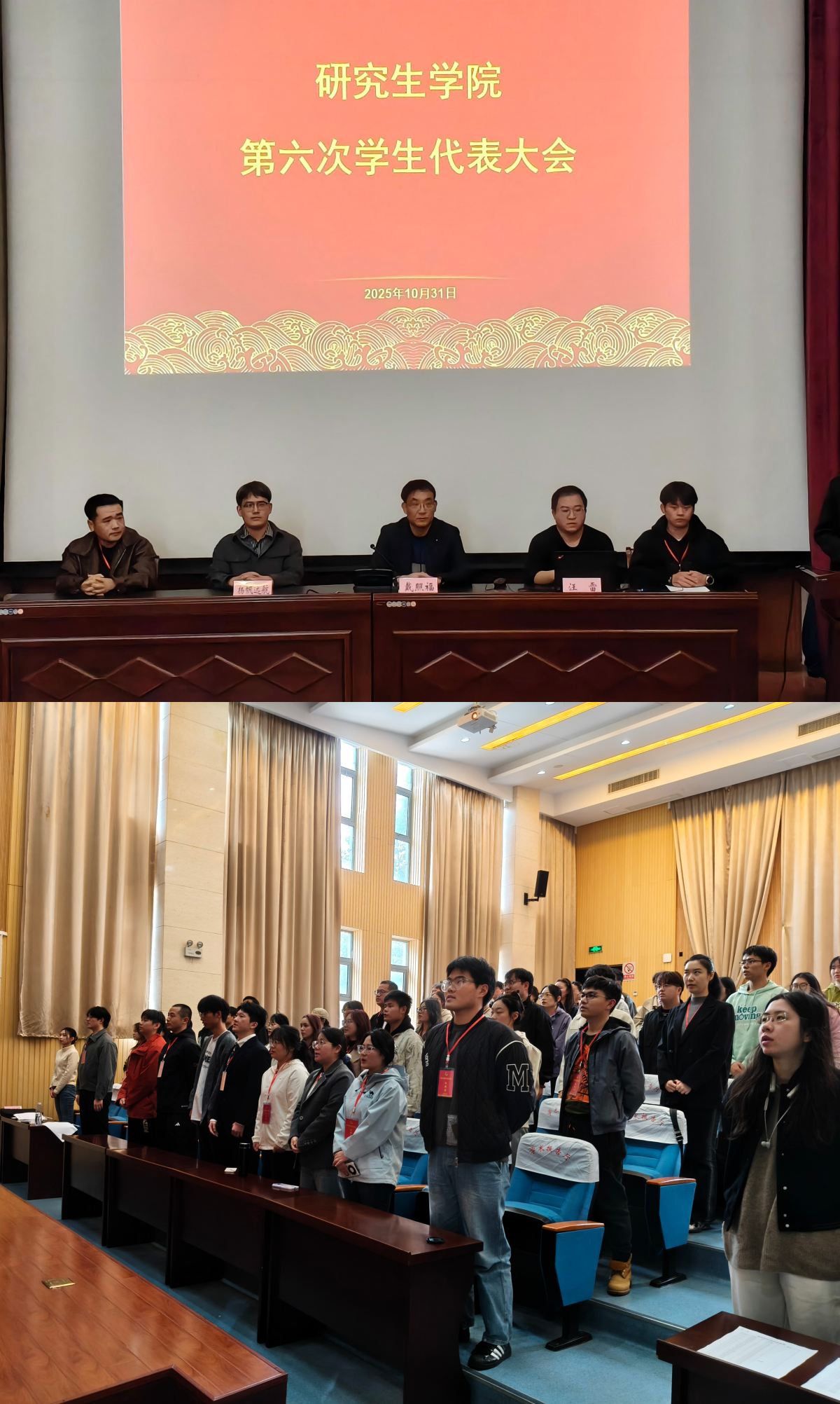 10月31日下午,研究生学院第六次学生代表大会在逸夫科技楼一楼报告厅召开。学院党委副书记、副院长戴照福,团委副书记汪雷,2025级团总支书记扬帆远航,以及26名学生代表出席会议。