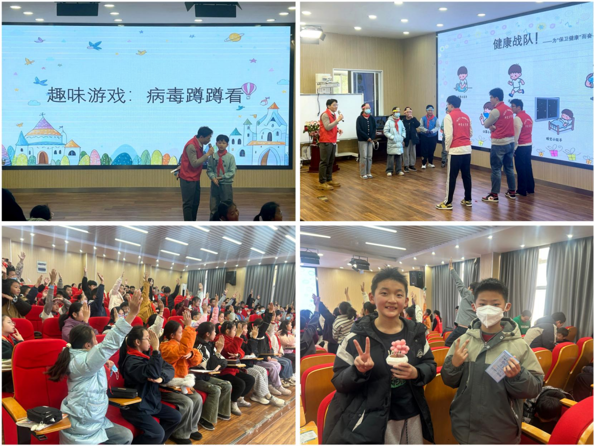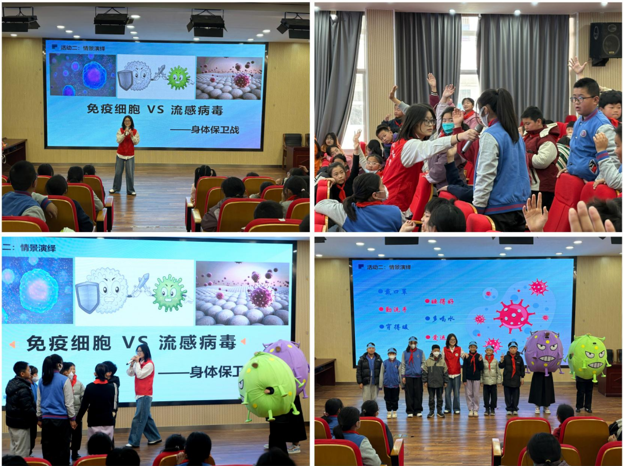 为将抽象的医学知识具象化,活动创新设计了多个互动环节。在情景演绎中,小朋友化身“免疫小卫士”,通过角色扮演理解免疫系统工作原理,并以良好卫生习惯为“武器”,成功“击退”流感病毒。通过融合健康口令的“萝卜蹲”趣味对抗游戏,让学生在玩乐中强化了勤洗手、多饮水、常运动等核心卫生防护意识,真正实现了寓教于乐。