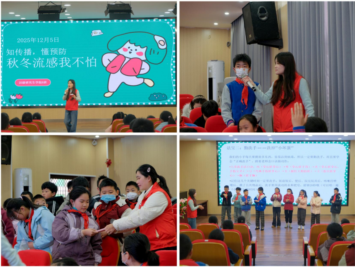 为深入践行医学研究生的社会责任与担当,将专业知识转化为服务社会的实际行动,研究生学院 2025 级 6 班团支部于 12 月 5 日上午组织志愿者走进芜湖市澛港小学,面向五、六年级学生开展了“医起行动,健康童行”青少年秋冬季流感预防健康科普活动,普及流感防护知识,提升青少年的健康意识与自我保护能力。