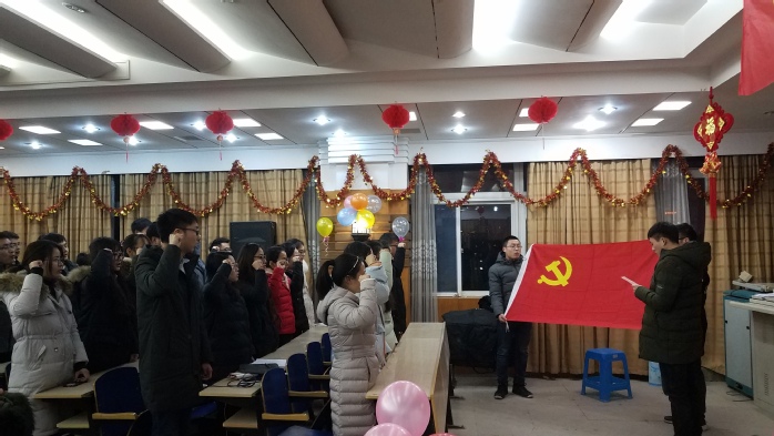最后,为严肃发展党员工作,增强党员意识,进一步激发广大党员的荣誉感、责任感和使命感,支部大会安排新发展的党员面对党旗庄严宣誓。宣誓完毕后发放了党员徽章,讲解了党员徽章佩戴和管理方面的规定,要求全体党员要规范佩戴党员徽章,主动亮明身份,自觉接受监督,发挥党员先锋模范作用。