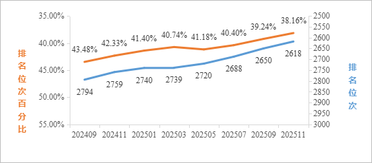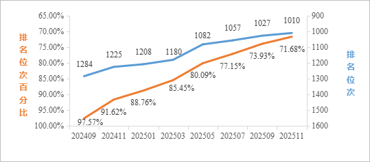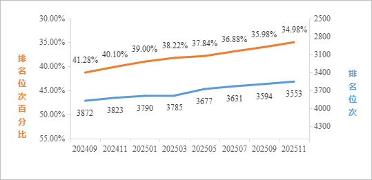2025年11月最新数据统计,在ESI所有学科综合排名中,全球共有10158家机构进入前1%,我校位列全球3553名,排名较1月提升237名,较去年同期(2024年11月)提升270名;位次百分比为34.98%,较1月提升4.02%,较去年同期提升5.12%。