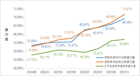 生物学与生物化学:据2025年11月数据统计,我校生物学与生物化学进入全球前百分之一潜力值为71.67%,较1月份提升14.95%,较去年同期提升17.17%。