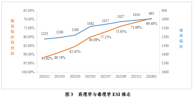 药理学与毒理学:据2026年1月数据统计,我校药理学与毒理学进入ESI前1%。全球共1432家进入全球前1%,我校位于全球第995名,排名较去年同期提升213位;位次百分比为69.48%,较去年同期上升19.28%。