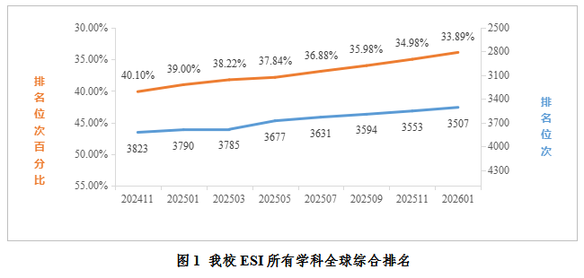 2026年1月最新数据统计,在ESI所有学科综合排名中,全球共有10347家机构进入前1%,我校位列全球3507名,排名较去年同期(2025年1月)提升283名;位次百分比为33.89%,较去年同期提升5.11%。