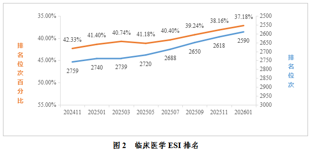 临床医学:据2026年1月数据统计,我校临床医学进入ESI前1%。全球共6966家进入全球前1%,我校位于全球第2590名,排名较去年同期提升150位;位次百分比为37.18%,较去年同期提升4.22%。