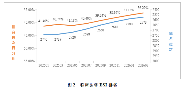 临床医学:据2026年3月数据统计,我校临床医学进入ESI前1%。全球共7091家进入全球前1%,我校位于全球第2573名,排名较去年同期提升166位;位次百分比为36.29%,较去年同期提升4.45%。