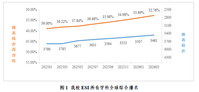 2026年3月最新数据统计,在ESI所有学科综合排名中,全球共有10565家机构进入前1%,我校位列全球3461名,排名较去年同期(2025年3月)提升324名;位次百分比为32.76%,较去年同期提升5.46%。